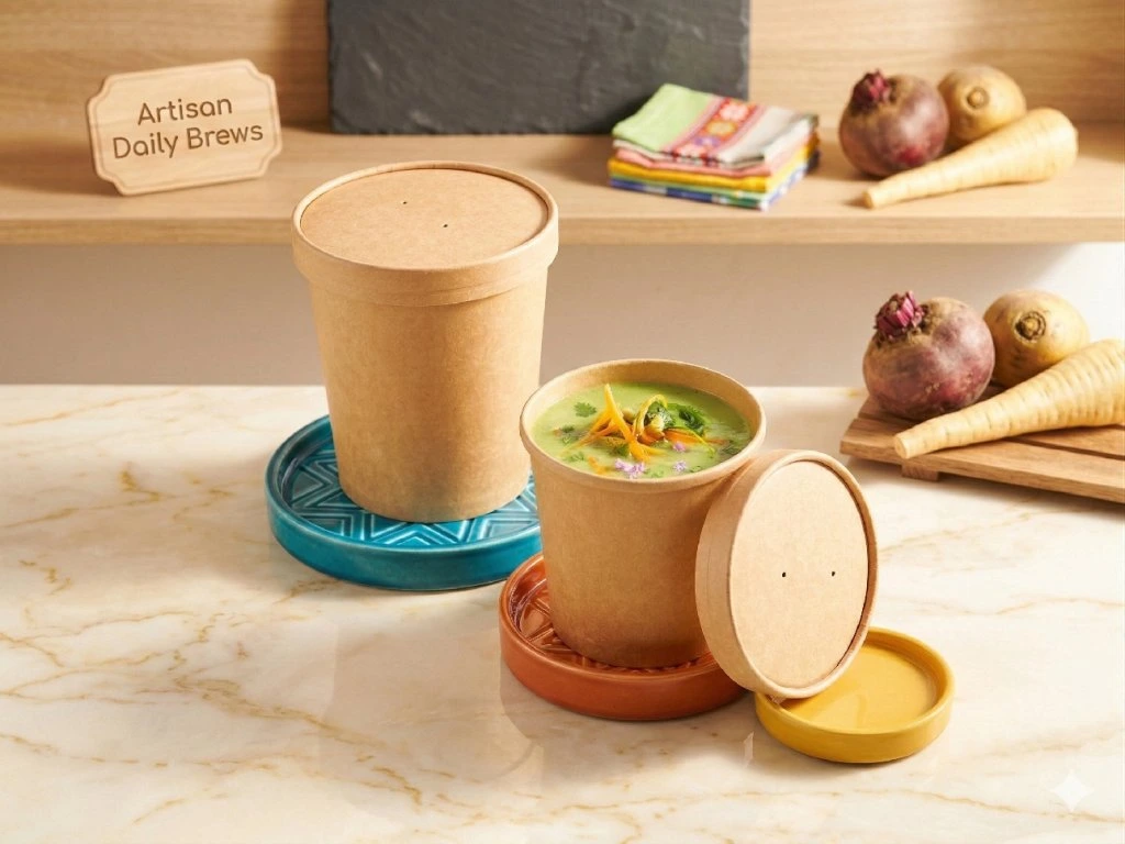 Miska na polievku z kraftového papiera je ekologická a udržateľná nádoba, vyrobená z odolného, hrubého a prírodného hnedého papiera. Kraftový papier jej dodáva rustikálny vzhľad a zároveň zabezpečuje pevnosť a odolnosť voči vlhkosti a teplu, čo z nej robí ideálnu voľbu pre servírovanie teplých jedál, ako sú polievky, guláše alebo iné tekuté pokrmy. Miska je často opatrená voskovým alebo biodegradovateľným povlakom, aby sa zabránilo pretečeniu. Má jednoduchý, ale funkčný dizajn a je ľahká na prenášanie aj skladovanie. Vďaka prírodnému materiálu je plne kompostovateľná a recyklovateľná, čo z nej robí obľúbenú voľbu medzi ekologicky zmýšľajúcimi spotrebiteľmi.